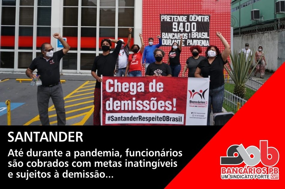 Mesmo durante a pandemia, funcionários são submetidos à cobrança de metas inatingíveis e sujeitos à demissão pelo não cumprimento das mesmas – Sindicatos de todo o Brasil denunciam nesta terça-feira (16) as arbitrariedades do banco Santander, através de manifestações em agências e departamentos do banco espanhol, que obtém no Brasil um terço do seu lucro mundial.