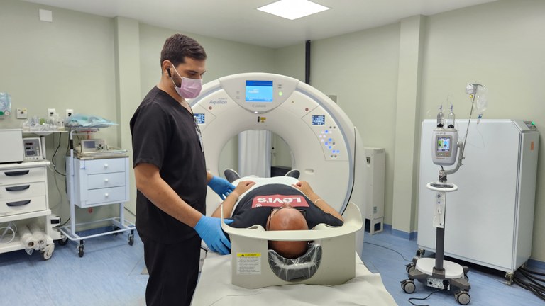 Conforme o coordenador de Radiologia, nos tomógrafos mais antigos, era necessário ajustar a técnica ao paciente para não expô-lo a uma quantidade de radiação desnecessária. Mas a nova máquina detém capacidade clínica completa assistida por IA (inteligência artificial), qualificando ainda mais os exames de imagem. “Quando o tomógrafo faz a primeira imagem, o software já lê os parâmetros do paciente e já define uma técnica, permitindo imagem legível sem uso desnecessário de radiação”, destaca Douglas Santana.